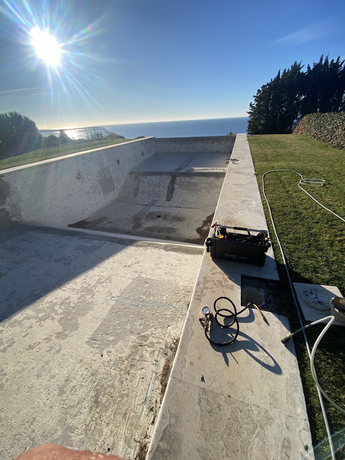 Dans certains cas, nous recommandons une mise sous pression de la piscine vide pour valider l’intégrité des canalisations enterrées. Cette méthode précise permet de révéler toute anomalie invisible lors d’une simple observation extérieure.